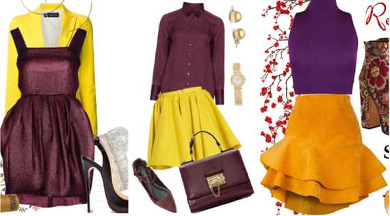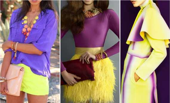Жёлтый и фиолетовый – это уже, практически, «классика жанра». Они идеально дополняют друг друга. А их цветовые волны, сливаясь, образуют белый цвет. Фиолетовый с жёлтым создают контраст дополнительных тонов. Один усиливает действие другого. Образ получится запоминающимся, но отнюдь не вызывающим. Такое сочетание будет уместно на вечеринке или свидании. Окружающие наверняка оценят Ваш вкус.
