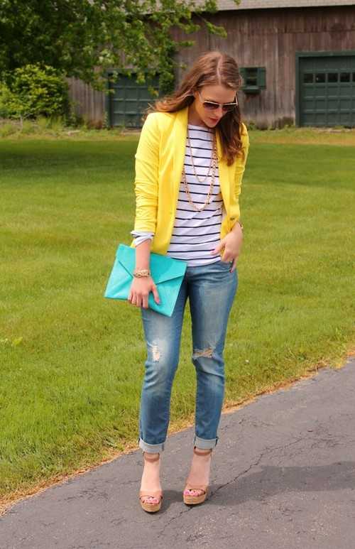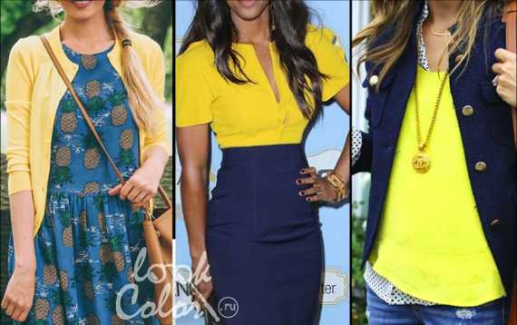 Желтый и синий. Сочетание жёлтого с синим универсально. Такой дуэт будет хорошо смотреться как в насыщенных, так и в приглушенных тонах. Сочетайте жёлтый верх с любимыми синими джинсами. Этот комплект не раз придёт на выручку, когда нужно будет быстро составить модный и удобный образ. Добавьте сюда балетки или туфли в тон топу и контрастные аксессуары.