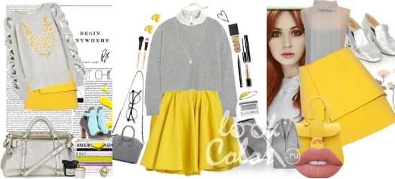 Желтый и серый. Более сдержанно и изысканно жёлтый выглядит в соседстве с оттенками серого цвета. Такой образ не будет кричащим. Аксессуары также стоит подобрать нейтральных тонов. Тогда жёлтый сыграет роль акцента, привлекая к себе внимание. Поддержать его помогут украшения в золотистой гамме. Несмотря на обилие в образе спокойных базовых цветов, девушку в таком наряде невозможно не заметить.