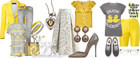 Если какой цвет и сочетается с желтым, то это серый, причем такой дуэт уместен в любом наряде. Яркость и насыщенность желтого сполна компенсирует умеренность и легкость серых тонов, делая сочетание невероятно гармоничным и мягким. Особенно нежно и тепло смотрится такое сочетание осенью, когда легкие желтые нотки скрашивают серость и унылость окружающих пейзажей.