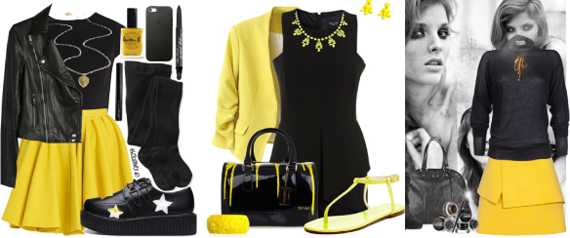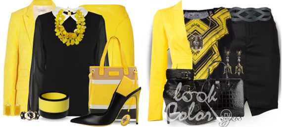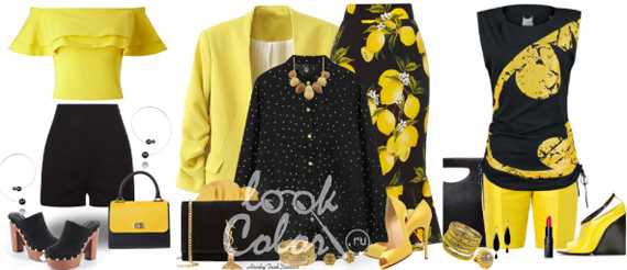 Так, комбинация с черным – это практически всегда классические и вечерние наряды. Однако, такое сочетание выигрышно далеко не всегда, поскольку любой перегиб сделает его аляповатым. Старайтесь избегать горизонтальных полос, которые сделают вас похожей на осу, а также чересчур ярких или мелких принтов, поскольку они утяжелят лук, лучше, пусть это будут однотонные вещи. Очень элегантно будет выглядеть наряд, в котором один из цветов доминирует, а второй лишь грамотно дополняет и завершает образ. Так, к примеру, деловой черный костюм можно разбавить желтой блузой, а желтое платье гармонично сольется с поясом и клатчем черного цвета.
