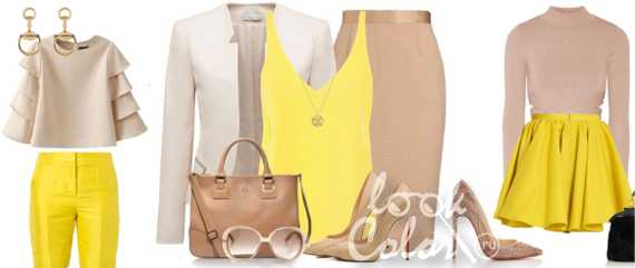 Выбирать свое сочетание с желтым цветом в одежде стоит относительно своего цветотипа внешности. Контраст ярких, чистых оттенков прежде всего доступен цветотипам «зима», «весна». Сглаженные, но все же сочные комбинации с желто-оранжевыми тонами подойдут для «осени». В пору «лета» придутся очень бледные, дымчатые тона в паре со сложными, не яркими оттенками. У них может быть достаточно высокий световой контраст, но сами цвета должны быть приглушенными.