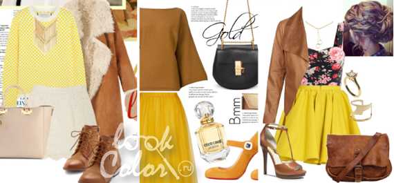 Золотистые: медовый, золотой, горчичный – это сложные оттенки, в построении которых участвует синий, черный, красный. Без блеска золотой используется редко, а его сочетаниям посвящена отдельная статья: сочетание золотого цвета в одежде. Горчичные, медовые цвета, как приближенные к золоту, создают благородные композиции со сдержанными оттенками.