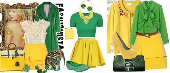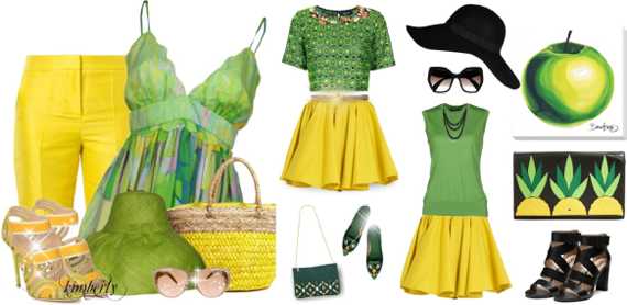 Зелёный и жёлтый – сочетание, сотворенное самой природой. Оно создаёт весеннее настроение. Неважно, какую пропорцию цветов Вы создадите в наряде. Он наверняка будет выглядеть гармонично. После зимы всегда хочется побольше солнечного света и тепла. Облачитесь в подобный образ, и Вы вполне можете стать чьим-то персональным солнышком.