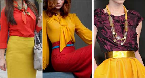 Также любителям эпатажа придется по вкусу сочетание желтого с красным или оранжевым. Несмотря на доминантный характер всех этих цветов, они смогут прекрасно «уживаться» в одном образе. Правда для этого необходимо чутко прочувствовать тончайшую грань между изысканностью и навязчивостью и не переступить через нее.