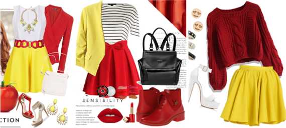 Красный и жёлтый располагаются на цветовом круге рядом друг с другом. Оба этих цвета насыщенные и тёплые, а потому вполне неплохо уживаются вместе. Только не стоит весь свой наряд составлять исключительно в этих оттенках: образ выйдет тяжелым и даже раздражающим. В комплект жёлтого и красного необходимо ввести третий, желательно нейтральный цвет. Хорошо подойдут белый и бежевый. Они смягчат общее впечатление.