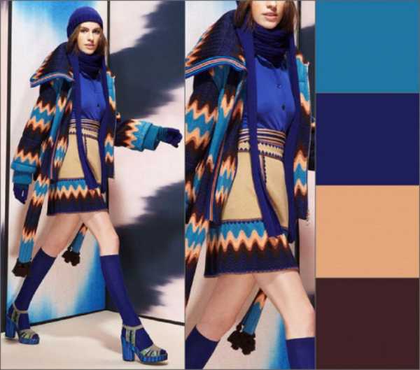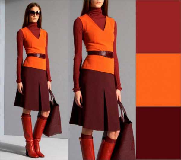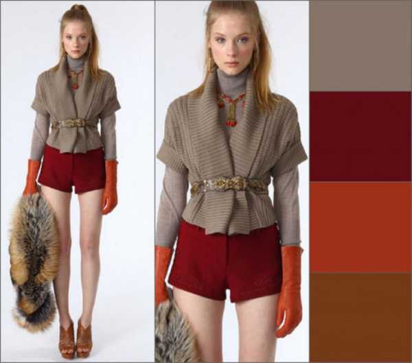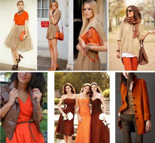 Для одежды, где использован коричневый цвет – тот, что ближе к рыжему, будут подходящими цвета: пурпурный и розовый, зеленый, синий, затемненный коричневый.