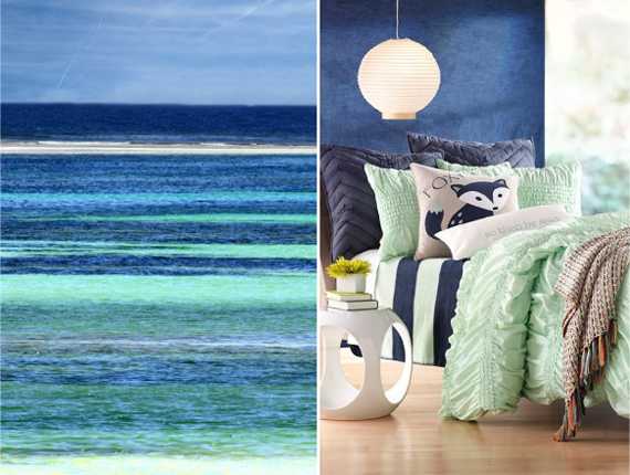 Синий и зеленый — сочетание родственных цветов. Какие ассоциации у нас возникают, глядя на него? Примеры в природе, интерьере, одежде. Фото.