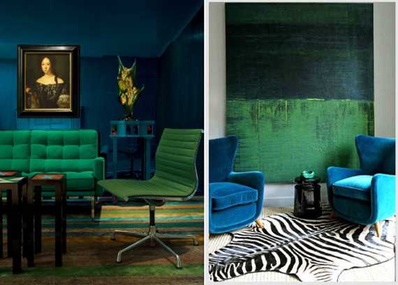 В интерьере это сочетание используется очень редко, и больше всего оно подойдет для дачных домиков или детских уголков. Несмотря на свою не контрастность, сочетание синего и зеленого достаточно яркое. Его любят дети, оно приятно для отдыха после простой работы с землей.
