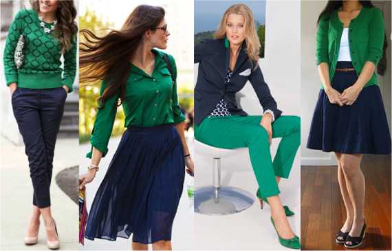 Сочетание синего и зелёного цветов смотрится удивительно гармонично. Ведь зелёный частично состоит из синего цвета, являясь родственным для него. Такие комплекты выглядят естественно, дарованные самой природой. С различными оттенками зелёного тёмно-синий цвет перестаёт быть тяжёлым и мрачным.