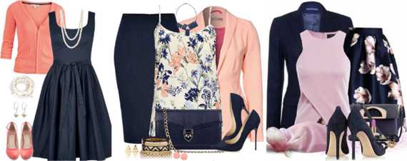 Сочетание темно-синего в одежде многообразно. Сам по себе строгий оттенок он «утяжеляет» мягкие, яркие, нежные тона, выводя их из зоны веселья и романтики на территорию строгого стиля, женственной утонченности, элегантности. Именно по этой причине его занесли в базовую палитру.