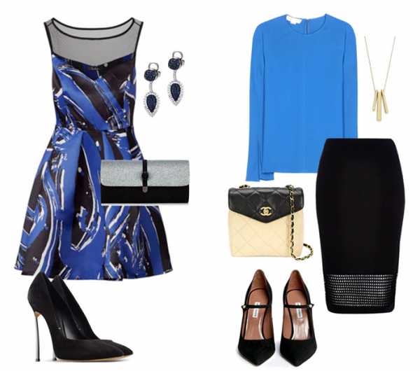 Сочетание чёрного с темно-синим может показаться мрачным и даже отталкивающим. Но только на первый взгляд. Такая комбинация великолепно смотрится в изысканных вечёрних нарядах. Золотые или серебряные украшения добавят образу шика. Светло-синяя блуза в комплекте с чёрной юбкой прекрасно подойдёт для делового вечера. При желании, всегда можно добавить для яркости аксессуары в другой цветовой гамме.