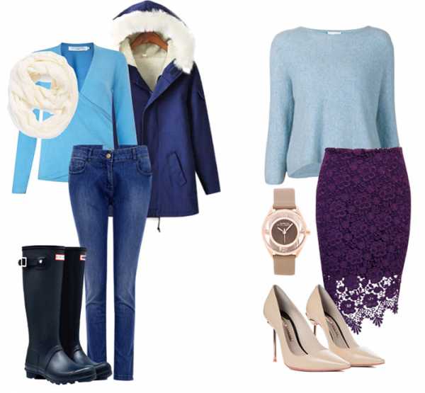 Легко выглядеть стильно в наряде, состоящем из вещей, выполненной в монохромной гамме семьи синего цвета. Голубой рядом с тёмно-синим создаёт изящную гармонию. Особенно идёт подобное сочетание девушкам с холодным цветотипом внешности. Фиолетовый тоже близок в цветовом кругу к синему. Такие комплекты будут выглядеть интересно, но достаточно спокойно.