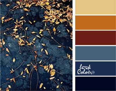 Эти сочные цвета не являются родными для фотографии, и, тем не менее, мы видим красоту, созданную природой в купе с человеком. Доведенная яркость до предела серого асфальта дало серо-синие и темно-синие оттенки, а старые листья, будто светятся. В комбинации задействованы соломенный, осенний оранжевый, темно-красный, серо-голубой, темно-синий, иссиня-черный.