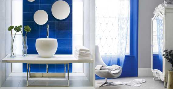 Белый и синий сочетание цветов – контрастное, выразительное. Его часто используют для оформления катков, горных трасс, стадионов, бассейнов. В домашнем интерьере – это ванные и туалетные комнаты, веранды, детские для мальчиков в морском стиле. Это сочетание хорошо для оформления детских лагерей, пансионатов, отелей у моря и т. д.