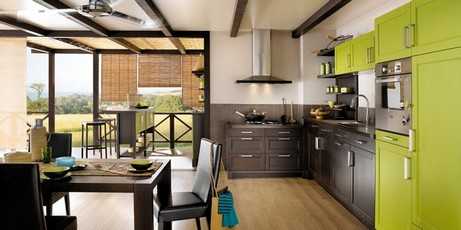 - коричневый, желтый и зеленый – естественное, натуральное, природное сочетание, напоминающее о листве на деревьях, подсвеченной лучами солнца. Такая комбинация наполнит комнату оптимизмом и гармонией, будет смотреться свежо. Для оформления гостиной можно использовать ярко-зеленые оттенки – салатовый или фисташковый, коричневый сбалансирует их чрезмерную энергетику. А вот доминирование желтого цвета хорошо подойдет для кухонного интерьера