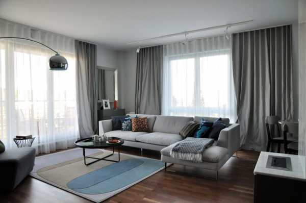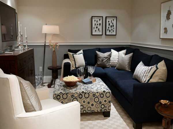 Бежевый или серый с синими акцентами – замечательный дизайн для гостиной. Обстановка получится очень уютной и комфортной.