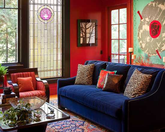Сочетание красный синий в интерьере добавляет яркости, индивидуальности помещению. Сочетание синего с розовым или лиловым добавляет чувственности и отрешенности.