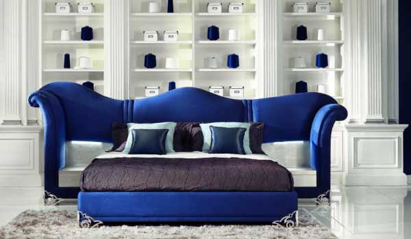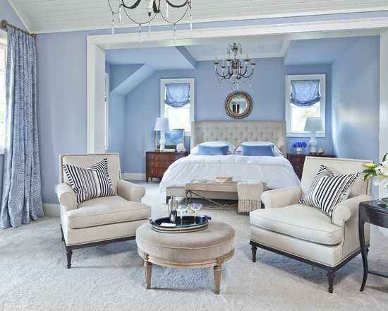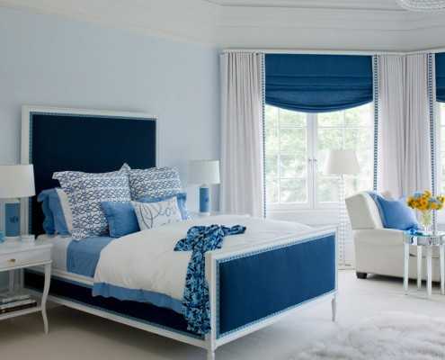 Для спальни нередко используется синий оттенок. Это связано с тем, что он хорошо расслабляет, способствует полноценному отдыху. Темные оттенки лучше не использовать, так как они создают угнетающую атмосферу и сильно воздействуют на нервную систему. Отличным сочетанием можно назвать мебель шоколадного или бежевого оттенка, а также синие стены. Постельное белье лучше использовать белое. Можно установить несколько зеркал.