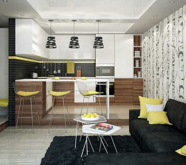 - Серо-голубые обои, кремовый для аксессуаров и яркий желтый или оранжевый гарнитур.