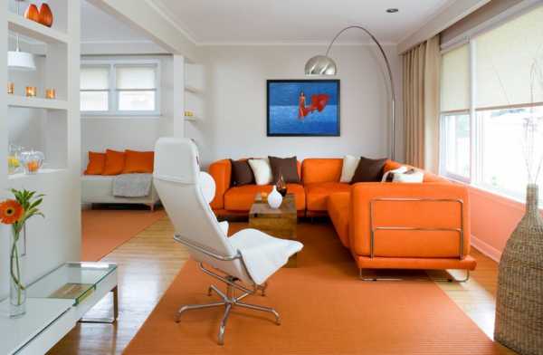 - Оранжевый. Лучшая комбинация из возможных. Гармоничный интерьер в тропическом стиле. Сочетание неонового оранжевого и ярко-синего утомительно для глаз. Выбирайте приглушенные тона – персиковый, тыквенный, лососевый, янтарный. Синий непременно должен быть ярким, иначе на фоне оранжевого он будет выглядеть блекло и невыразительно. Подойдет и ярко-голубой.