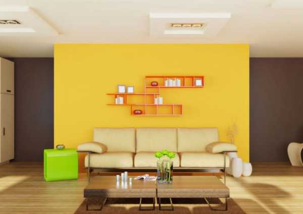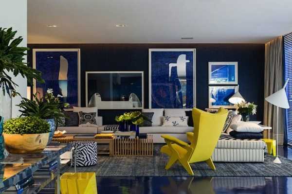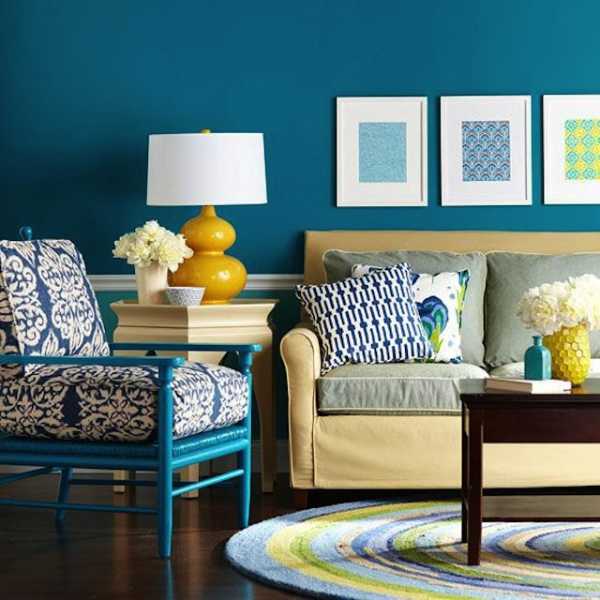 Желто синее сочетание можно назвать драматичным. Даже бледный, золотистый оттенок будет вносить значительный контраст теплого и холодного в комнату.