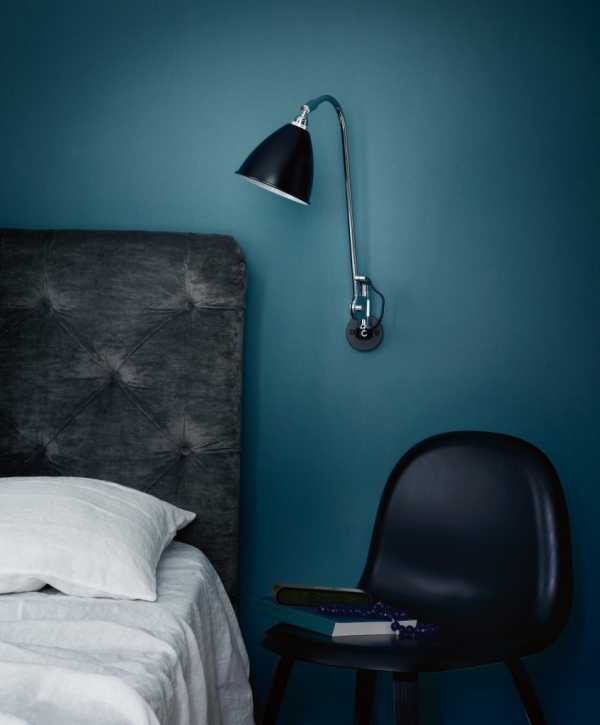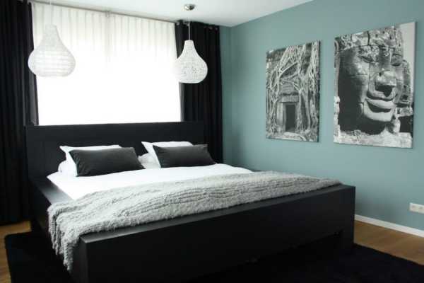Черный цвет с синими стенами в интерьере спальни будет неудачным решением. Такое сочетание создаст мрачное впечатление, окружающая обстановка будет «давить». Если интерьер уже создан, то для его корректировки следует использовать лампы, дающие желтый цвет.