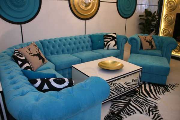 Массивная синяя мебель в гостиной смотрится каким-то инородным телом, если ее не дополнить подушками или чехлами других тонов, использованных в ее оформлении.
