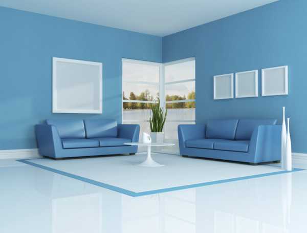 В просторных помещениях ярко-синий для стен лучше не использовать – покажется, что комната пустая. Загромождать ее мебелью тоже нежелательно. Выбирайте пограничный тон – голубовато-зеленый, лавандовый. Светлый и холодный голубоватый тон создает ощущение чистоты, даже стерильности. Усилят это впечатление серебристо-серый и серо-стальной. Такой дизайн подходит для офиса и жилых помещений в стиле минимализм и хай-тек. Важно найти баланс, иначе комната будет напоминать аквариум или ледяной домик.