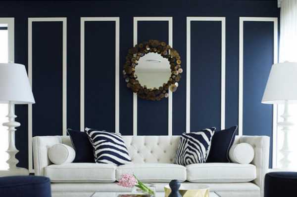Чтобы визуально расширить комнату, для одной из стен используйте синий, для остальных – нейтральный тон. На той, что напротив синей, повесьте большое зеркало.