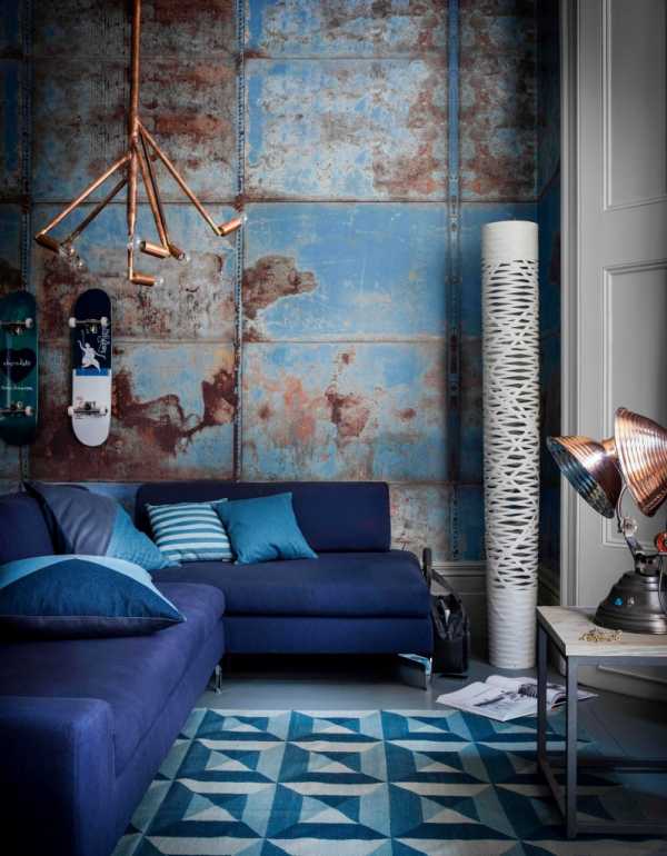 Интересно смотрятся в интерьере темно-синие стены с коричневыми вкраплениями. Такое оформление просто идеально. Особенно хорош синий в сочетании с оттенком какао, корицы.
