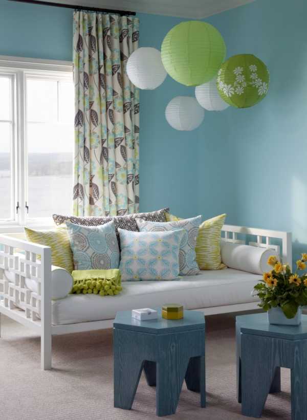 Если хочется сделать комнату по-летнему яркой, то можно смешать его с салатовым, жёлтым, коралловым. Все они должны быть насыщенными, но не занимать не слишком много места в инт
