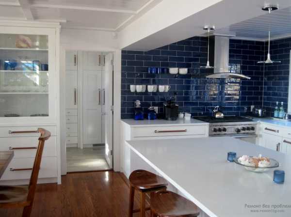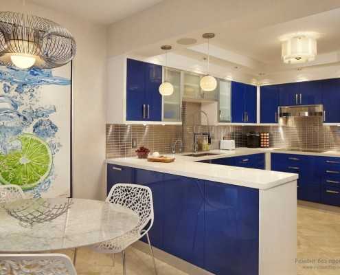 Синие стены в интерьере кухни отлично подойдут для тех, кто следит за своей фигурой. Данный оттенок снижает аппетит. Однако всю кухню оформлять только в одном цвете не стоит. Синий в этом случае утомляет и выглядит неэстетично.
