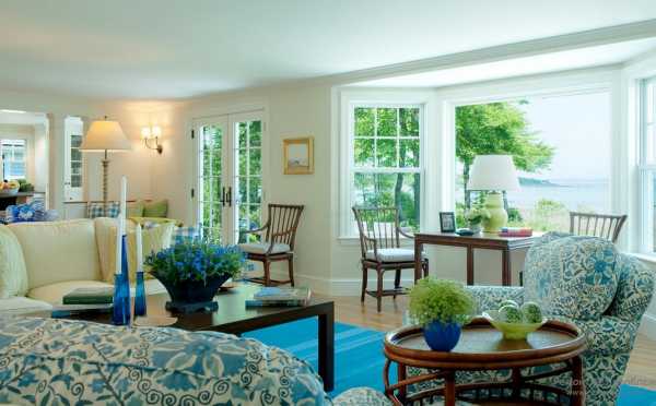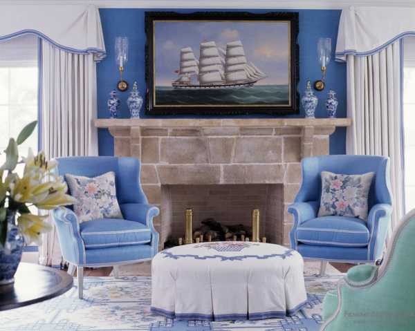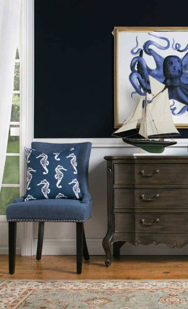 Вообще, морская тематика в последнее время набрала особую популярность среди синих интерьеров. Она выражается в сочетании синего цвета в интерьере с белым. Он ассоциируется с морской пеной и блеском воды. К нему добавляются золотые, коралловые или розовые оттенки в очень не большом количестве. Такие интерьеры стильные, спокойные и яркие. В них так же отражается популярность белых интерьеров. Бело синий интерьер – романтичен, так как море — стихия романтиков. Свежесть, строгость и сентиментальность сине белого интерьера приглянется как женщинам, так и мужчинам.
