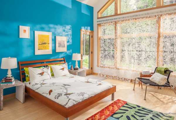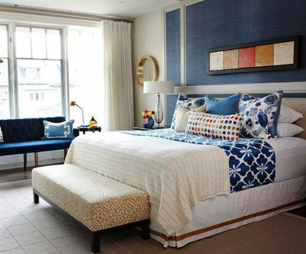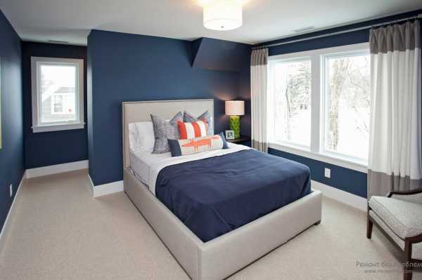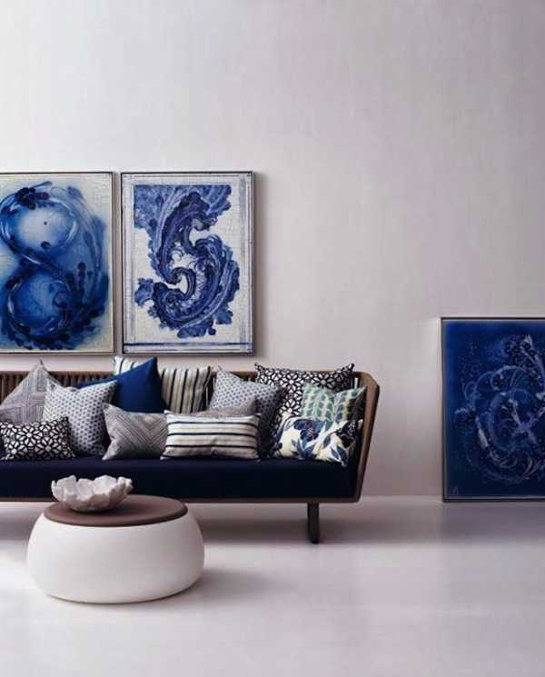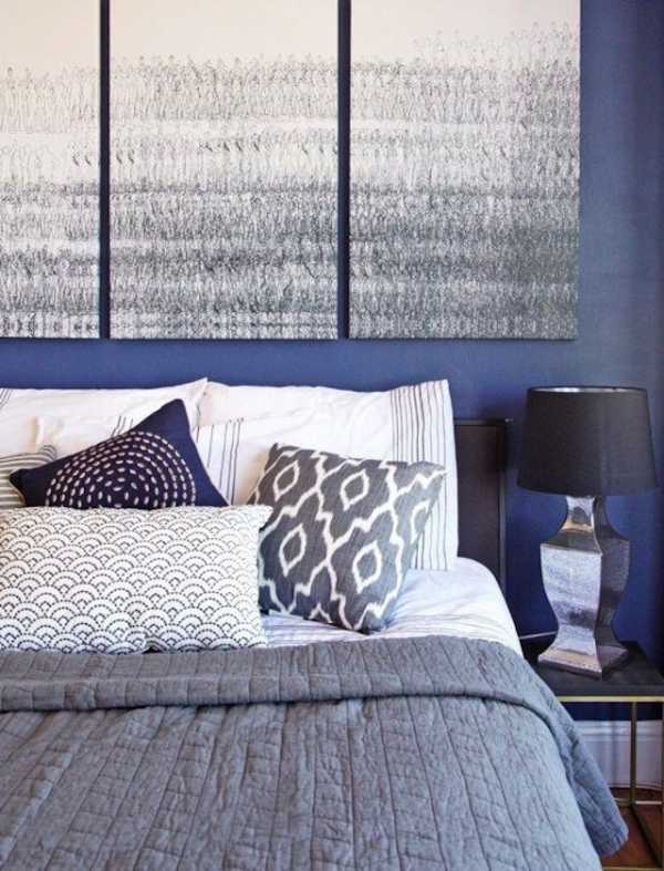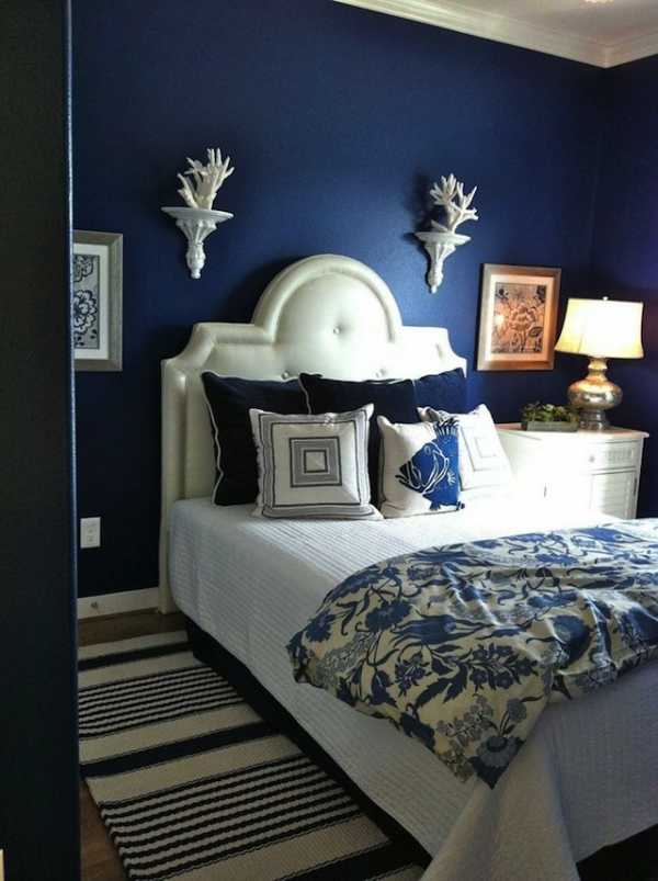 Лучше всего синие стены в интерьере будут смотреться в маленькой комнате. Из-за того, что углы и поверхности «растворяются», помещение выглядит уютным. Нередко синий оттенок используется в спальнях. Если комната имеет большую площадь, то темный тон будет не к месту. В этом случае нужно использовать аквамариновый, голубой. Можно добавить интересные акценты, например, яркие подушки, пуфики, шторы, картины.