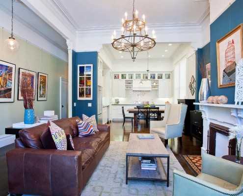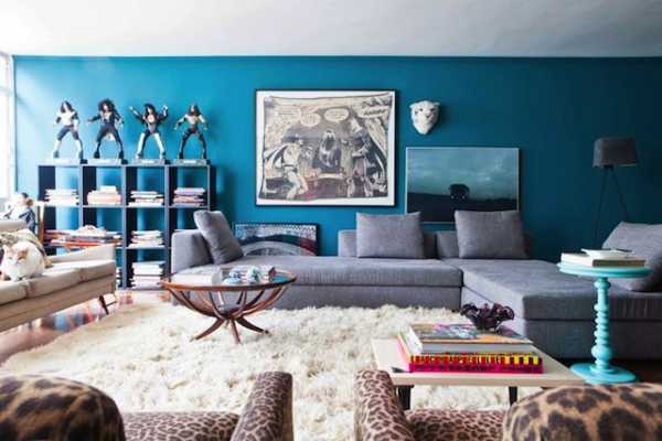 Интересно смотрятся синие стены в интерьере вместе с другими оттенками этого тона. Можно использовать аквамариновый и голубой. Это прекрасное сочетание. Аксессуары можно выбрать любого оттенка, стены должны быть светлыми, а мебель темной.