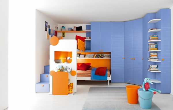 Синий цвет в интерьере детской можно использовать, добавив белый – получится морской дизайн. Этот цвет уместен в зоне для учебы, так как помогает сконцентрироваться. Чтобы обстановка получилась более теплой и радостной, добавьте красный, зеленый желтый и оранжевый. Не используйте этот цвет для тихих, апатичных детей. Их он вгонит в депрессию. Гиперактивным детям он, наоборот, просто необходим.