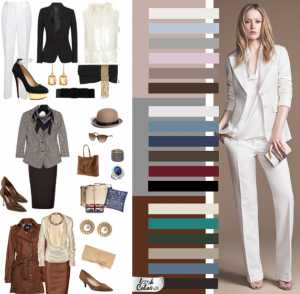 Сочетания строятся на основе черного, темно-синего, серого, коричневого цвета. Темные цвета в классическом стиле предпочтительны, хотя светлая палитра тоже присутствует.