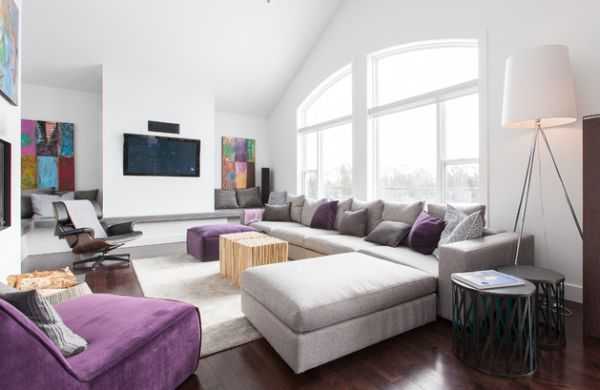 фиолетовая и серая мебель в интерьере гостиной