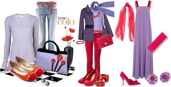 Сочетание сиреневого с красным – яркое, пронзительное и нереальное. Светлый фиолетовый уводит за собой динамичный красный, его природа насыщения заставляет светится горячий цвет, что может показаться даже чересчур пронзительно, поэтому лучше подбирать приглушенные, светлые или темные красные оттенки. Для примера рассмотрите сочетания со светло-красным, красным кораллом, рубиновым, ярко-бордовым, винным.