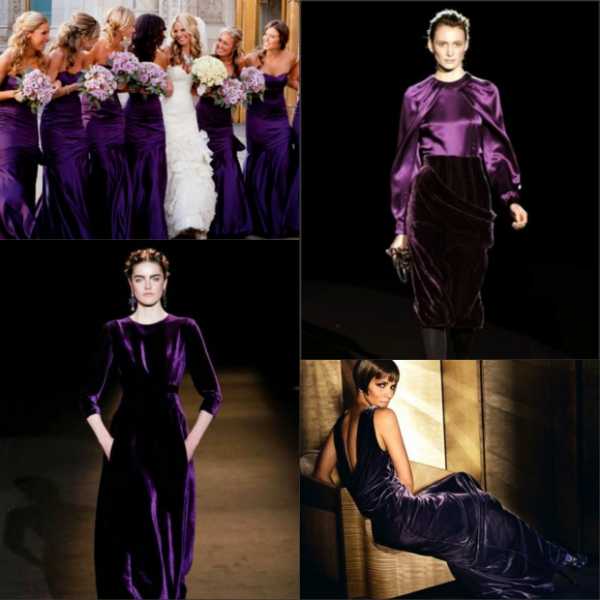 Глубокий фиолетовый цвет смотрится очень богато, особенно на бархатных тканях. Платье из бархата тёмно-баклажанного цвета могут быть абсолютно просто скроены, и от этого оно будет выглядеть ещё более аристократично. Этот цвет придаст загадочности и таинственности, он не нуждается в дополнительных украшениях и акцентах. Фиолетовый цвет настолько самодостаточный, что, облачаясь в него, можно не задумываться об изысках макияжа и дорогих аксессуарах.