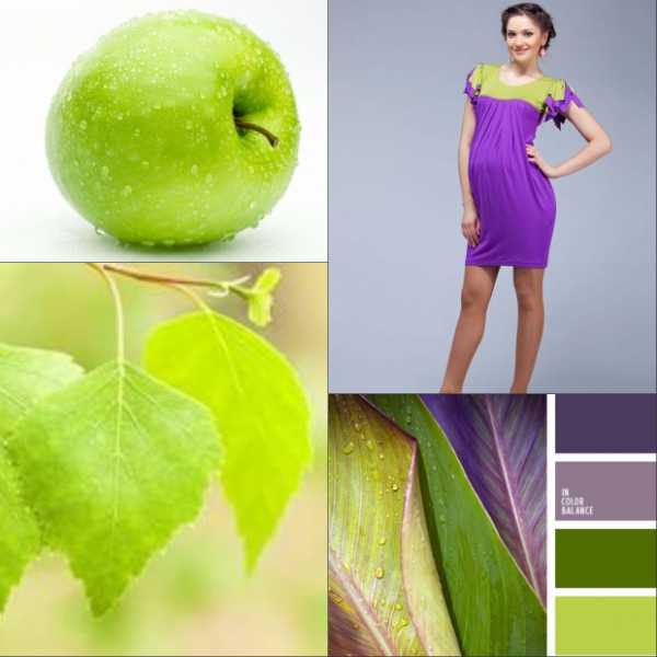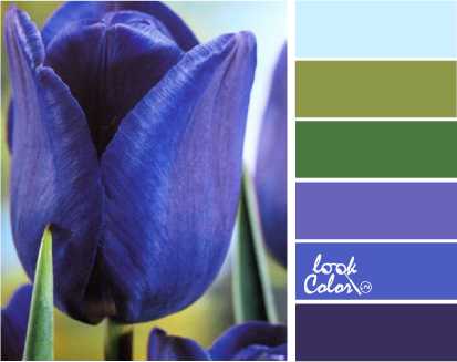 Как сочетать фиолетово-синий и теплый зеленый? Для создания такой комбинации подойдут любые тона зелени с преобладанием желтого или примесью красного, но стоит соблюдать правила равной контрастности тонов, то есть примесь серого в основном цвете и сочетаемом с ним должна быть одинакова. Палитра состоит из бледно-зеленого, зеленого горошка, шартреза, болотного, коричнево-зеленого.