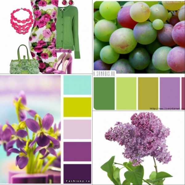 Эта пара естественная, легкая, привлекательная. Она напоминает весеннюю зелень и цветы. Позитивная, энергичная композиция полностью стоит на цветовом различии, так как все остальные цветовые контрасты мало действуют в ней. Палитра включает в себя бледно-зеленый, шартрез, оливковый, хаки, коричнево-зеленый.Сиреневый сочетается с холодным зеленым даже более привлекательно, чем с теплым. Секрет состоит в тепло-холодном контрасте, которой ложится в основу этой пары. Все остальные оттеняющие моменты сводятся на нет, чем достигается мягкость, легкость и обаятельность. Для сочетания были взяты цвет воды, ментоловый, мятный, келли, малахитовый.