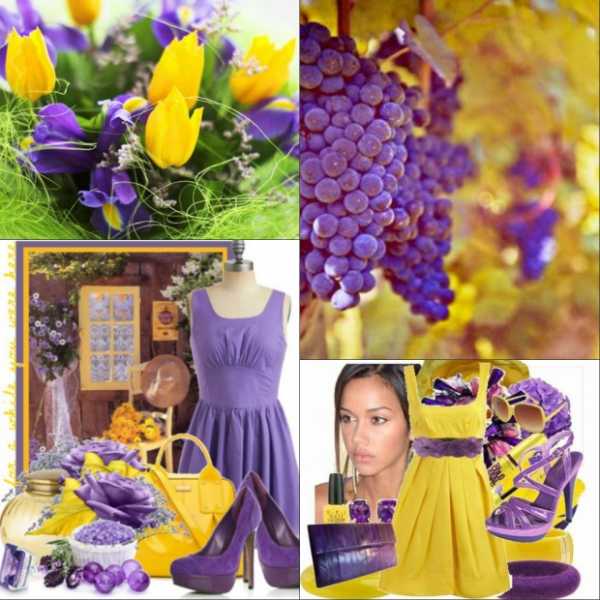 Фиолетово-синий и желтый – сочетание с высоко привлекательным качеством. Оно построено на дополнительном контрасте, по этому рекомендуется смягчить оттенки желтого до золотистых (с примесью синего и/или красного). Для примера сочетания с цветом шампань, медовым, горчичным, янтарным, ярким золотом.