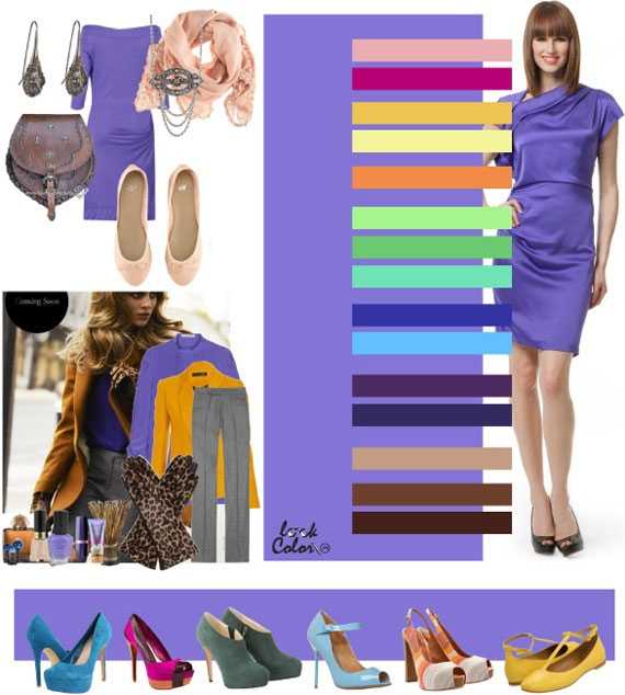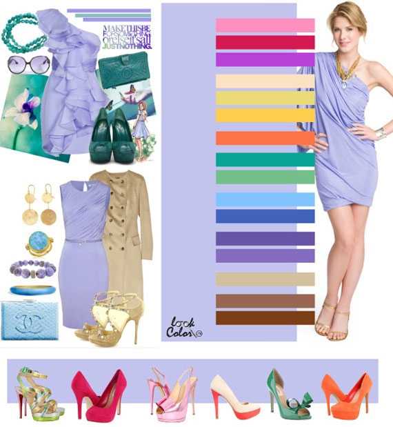 Сочетание сиреневого цвета экзотичные и загадочные, впечатление от них зависит и от его оттенка. Для вашего внимания 6 палитр с 16 цветами + подборка обуви.