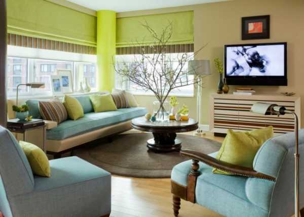 На следующем фото используется цвет киви и светло-синий цвет. Цвет киви — своеобразный, относится не к теплым, но и не к холодным. Зеленые фруктовые оттенки отлично сочетаются с синим и голубым. На следующем фото мы видим стены гостиной фисташкового цвета, светло-голубой потолок, темно-оливковый диван, темно-голубой стул.
