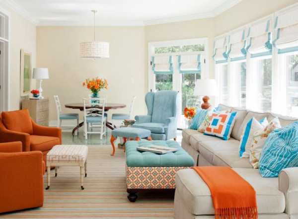 Мягкая мебель голубой окраски гармонирует с более темными или насыщенными оттенками стен, текстиля и аксессуаров. Хороший ансамбль создается с ярко-желтыми и оранжевыми шторами или другими предметами интерьера.
