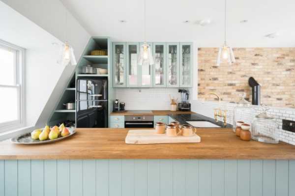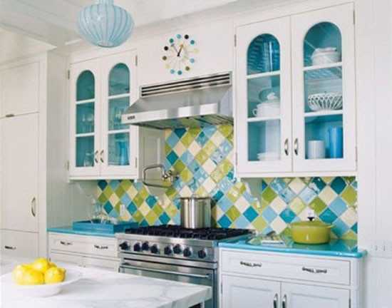 ♦ Спокойствие травного. Интересным будет сочетание травянистого оттенка с оттенками голубого. Используйте берлинскую лазурь, бирюзу и барвинок (бледно-сиренево-голубой). При этом общий фон кухни лучше оставить белым, самый спокойный тон отдаем мебели и частично стенам. А вот посуда здесь важна яркая, выставленная напоказ. Декорируем такую кухню по минимуму, используя лишь необходимые предметы быта.