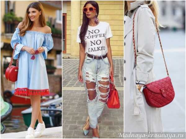 Красиво смотрится красная сумка, повторенная цветом в любом элементе гардероба, кроме обуви. В этом случае вспомнить о красном ремне, поясе или перчатках будет нелишним. При выборе стоит учитывать недопустимость соединения в гардеробе двух красных вещей разного тона.
