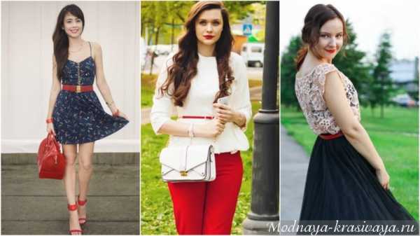 Красный ремень способен сделать ярким строгий деловой костюм и платья серого, бежевого или черного цвета, изыскано смотрится выбор помады под его цвет.